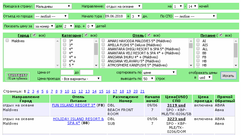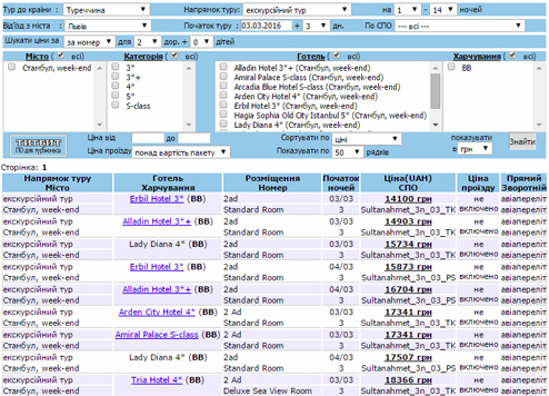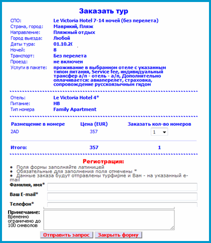 Заказчик по широкому набору параметров поиска подбирает нужное, "кликает" на цене турпакета, открывает